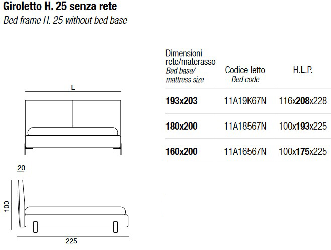 Versions with slatted frames H. 14 or H. 25 can be paired with the following legs:
