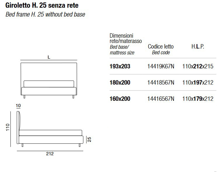 Versions with slatted frames H. 14 or H. 25 can be paired with the following legs: