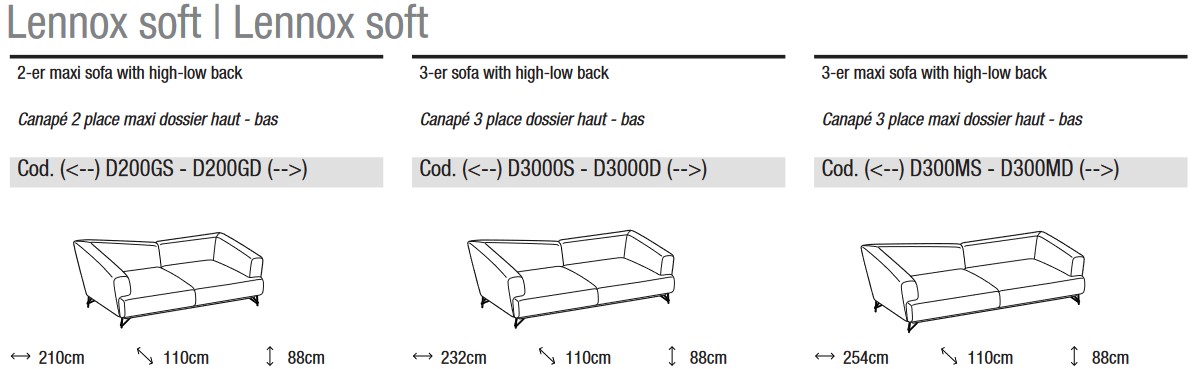 - Lennox Soft right high and low backrest 3-seater maxi - L. 254 cm x D. 110 cm x H. 88 cm